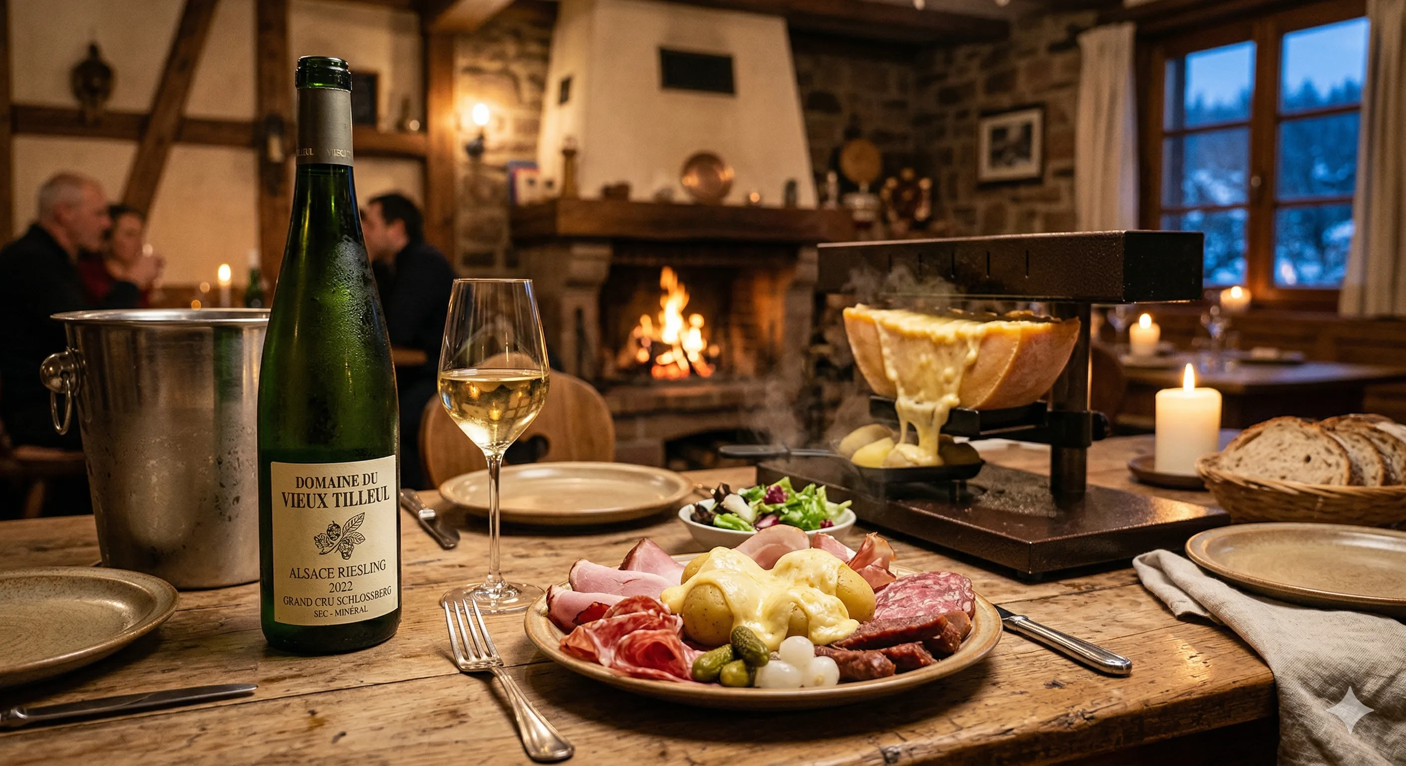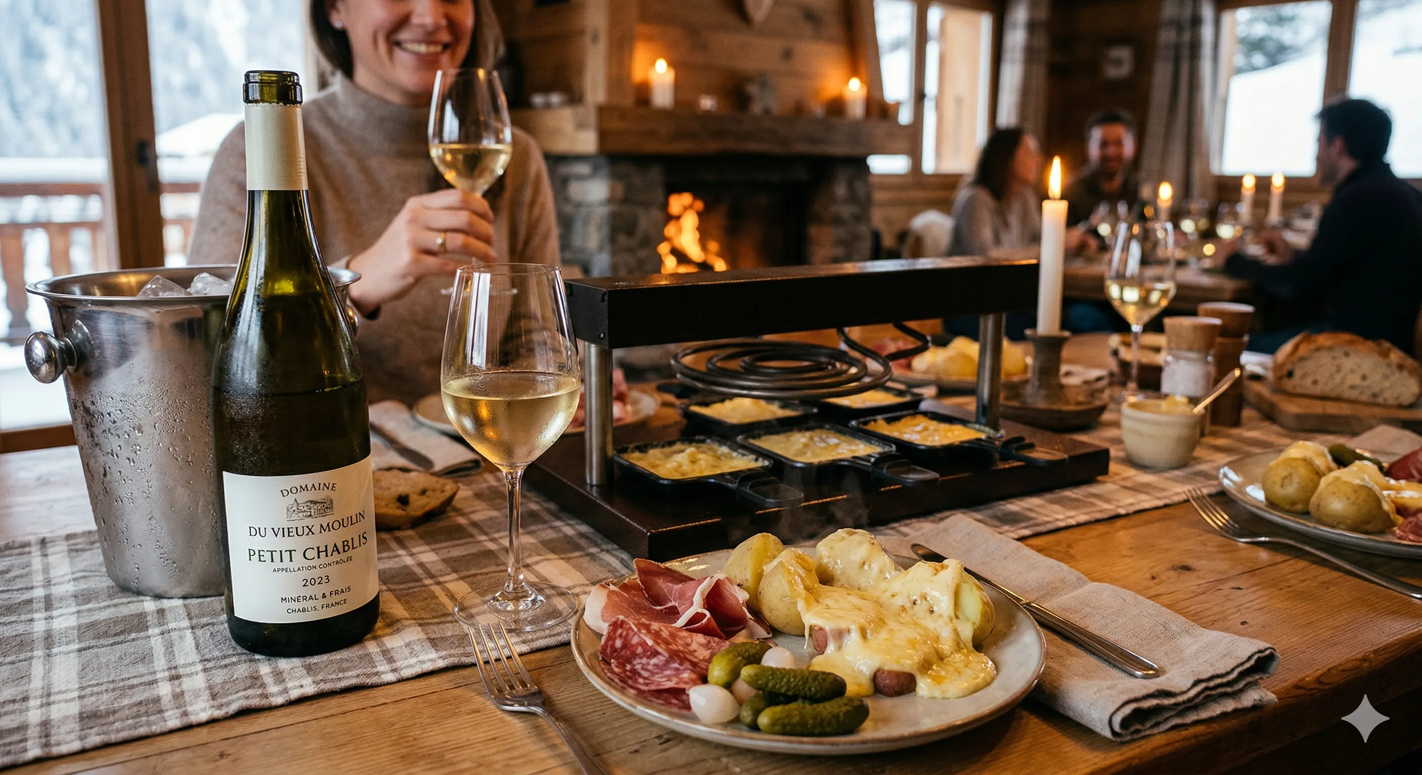 Le Chablis est l'un des meilleurs accords blancs pour la raclette. Son acidité vive coupe la richesse du fromage fondu, tandis que sa minéralité intense crée un contraste parfait.