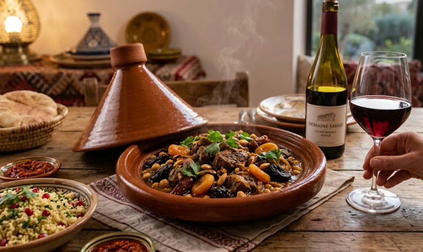 Pour un tajine d'agneau, privilégiez les vins rouges du sud à base de syrah, grenache ou mourvèdre, qui offrent une belle structure, des tanins fondus et des arômes de fruits noirs et d'épices. Servez à 16-17°C pour sublimer l'accord.